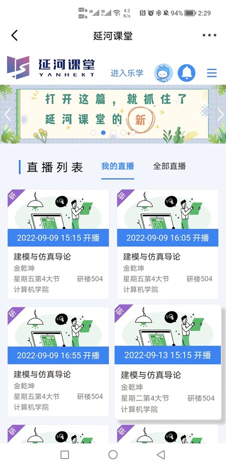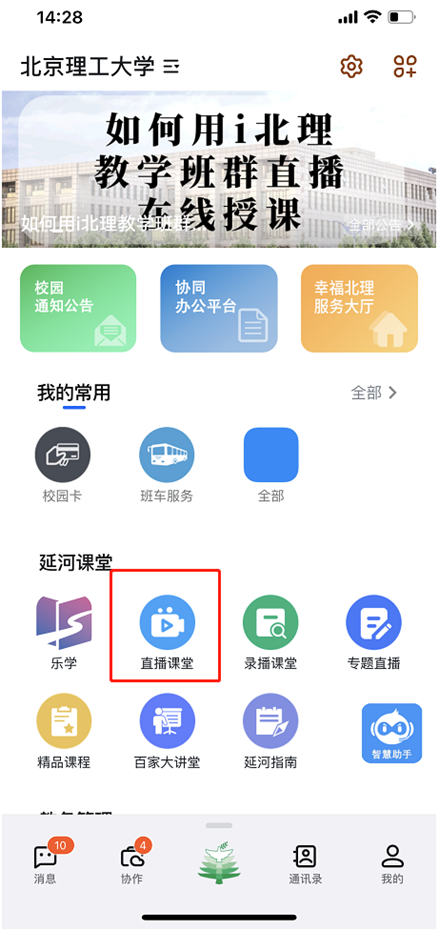 延河直播/录播是按照课表进行自动录制,在上课前1分钟开始,上课结束后3分钟停止。录制内容分为电脑PPT页面和教室后置摄像头采集的上课画面。请任课老师上课前,用手机登录i北理App,进入延河课堂->直播课堂,可查看开始的课程直播。