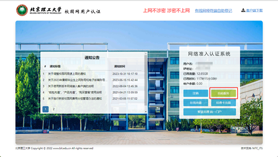 使用浏览器访问10.0.0.55,使用登记哑终端设备的账号密码进行登录,点击页面右侧“自助服务”。