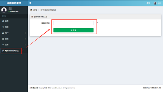 点击页面左侧“哑终端准出代认证”,输入该哑终端设备的IP并登录,即可实现哑终端访问互联网;如需停止访问互联网,请点击下线。