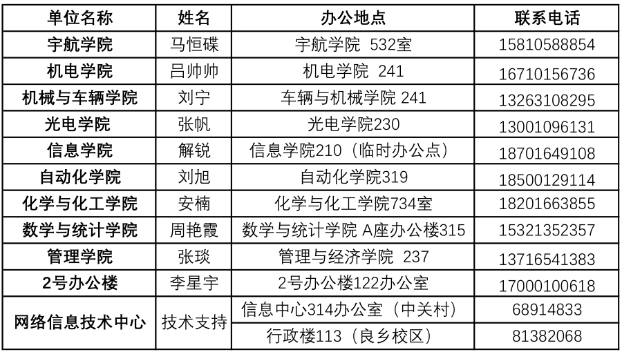作为先期试点,本学期信息服务专员队伍将入驻中关村校区和良乡校区的部分单位,信息如下: